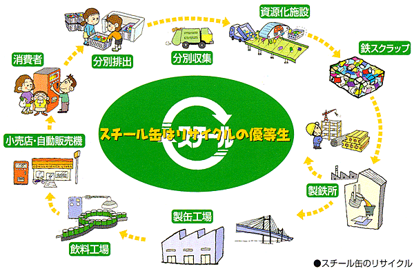 私たちの行っている事業は、資源のリサイクルに大きく貢献しております。 スチール缶は、「何にでも」「何度でも」リサイクル可能な素材です。 このスチール缶の環境面での優位性を多くの人に理解していただき、循環型社会の実現に向けて一歩でも進んでいきたいと考えております。 |