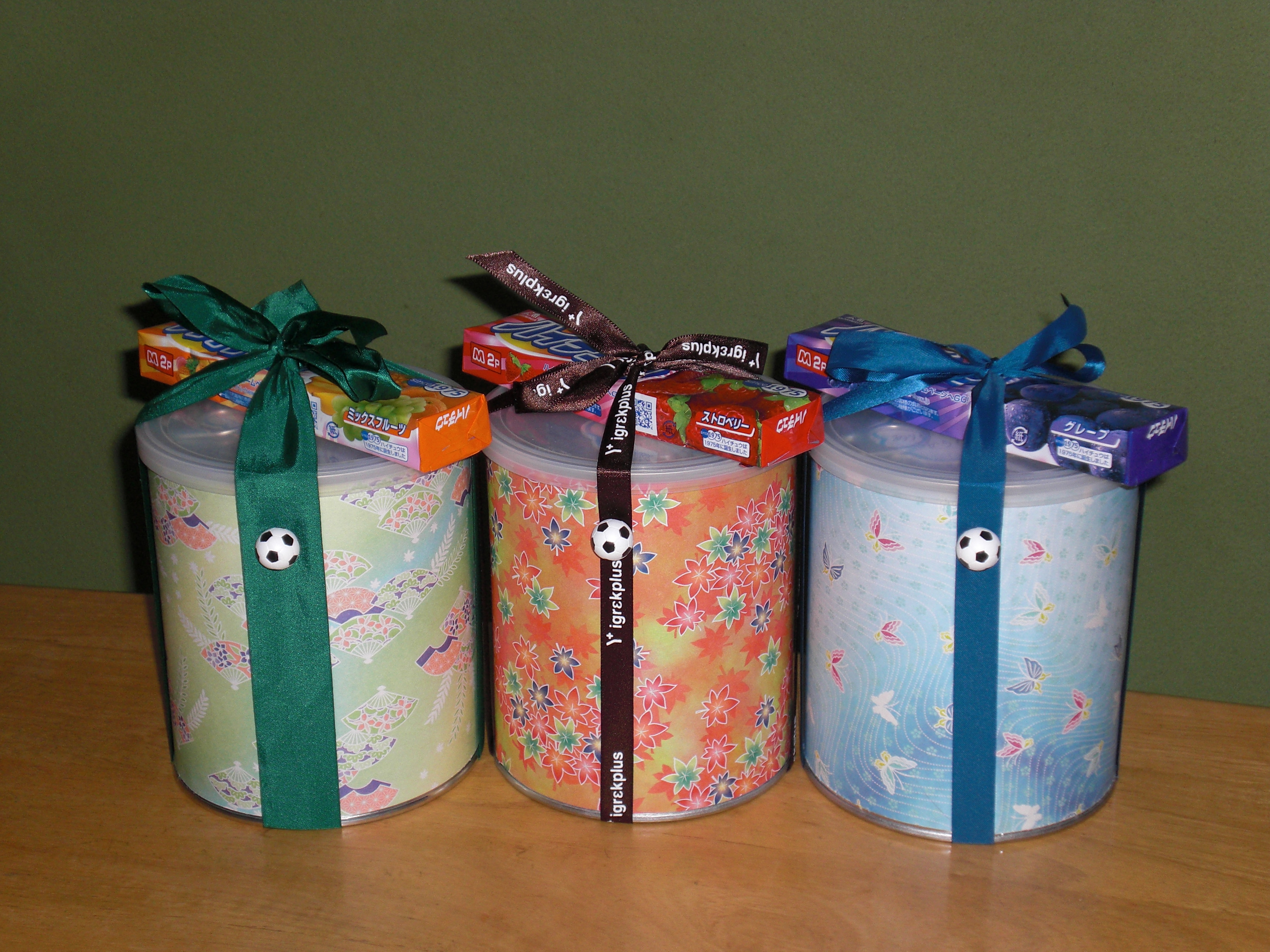 素敵な作品を見せていただきました。 お世話になっている方達にお菓子をプレゼントされたそうです。 サッカーをやっていた彼は、サッカーボールの磁石を見つけ、缶にくっつけたそうです。 翌日、見せに来てくださいました。 磁石を使ってもいいんですね。 すばらしい缶詰にしていただきありがとうございました。 提供 藤井寺市 Nさん |